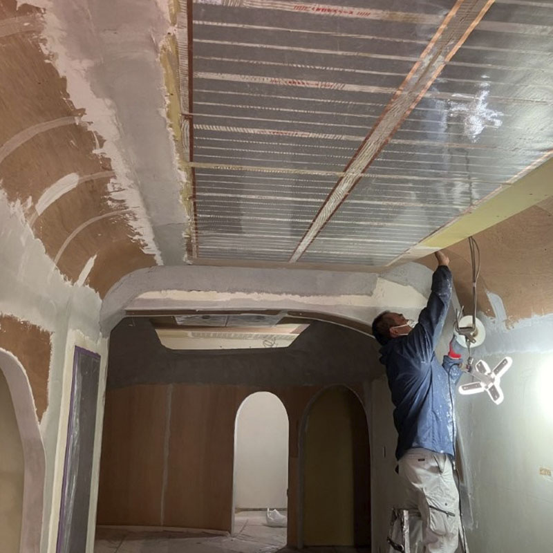 サンウオームは、独自の特許技術である特殊和紙ヒーターを天井(一部壁)に埋め込み、壁・天井を自然素材である珪藻土(ケイソウくん)で仕上げた快適/健康並びに超省エネ性能を併せ持つ遠赤外線ふく射熱暖房システムです。