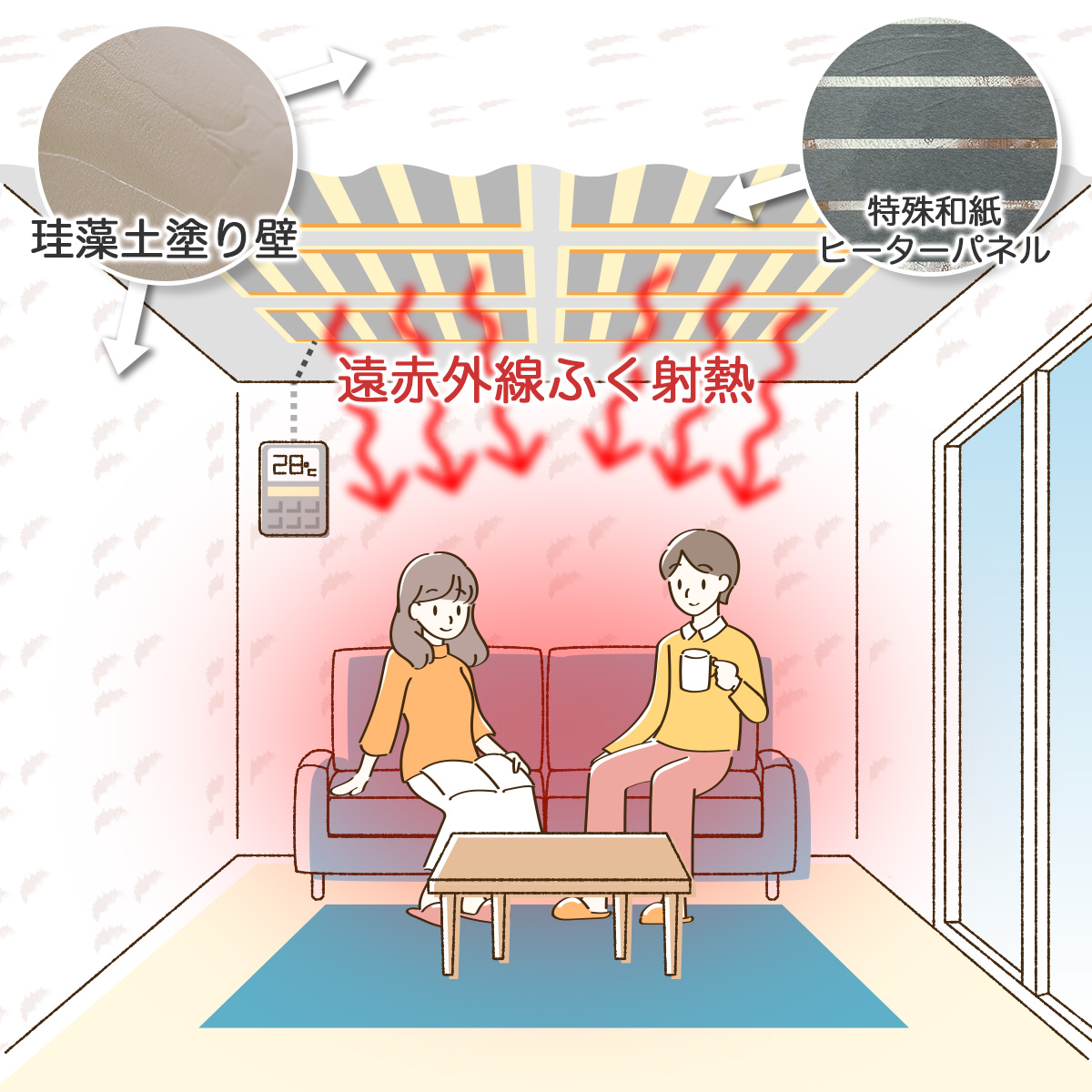 特殊和紙ヒーターは遠赤外線によるふく射熱で無風・超省エネの暖かさを実現。また珪藻土塗り壁材は湿気や匂いを吸収し、お部屋の快適さを保ちます。